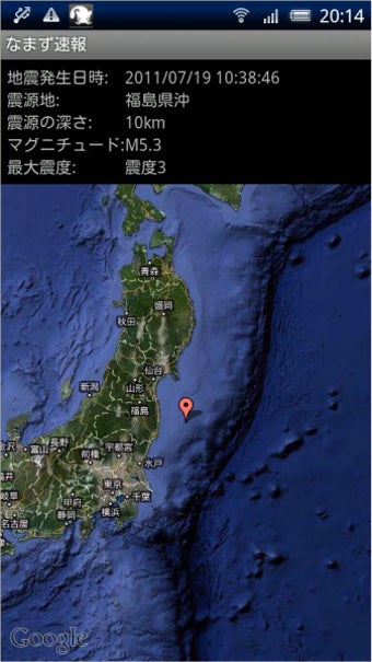 なまず速報 βは、気象庁が発表する緊急地震速報を通知してくれるアプリです。プッシュ通知(外部サーバーと連携してリアルタイムで情報を通知してくれる機能)にも対応しており、いち早く国内の地震情報を知る事ができます。通知してくれるのは地震発生日時やマグニチュード、最大震度、震源の深さ、震源地の地図などの情報です。地震に遭った時などにその状況を素早く把握できる防災用アプリです。